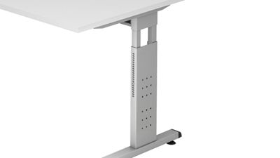 Ihr Wohlbefinden steht beim Eckschreibtisch ULM im Mittelpunkt. Die manuelle Höhenverstellung von 650 bis 850 mm ermöglicht es Ihnen, die Arbeitshöhe an optimal an Ihre Sitzposition anzupassen. So beugen Sie Verspannungen vor und fördern eine gesunde Körperhaltung. Das stabile C-Fuß-Gestell mit Bodenausgleichsschrauben sorgt für sicheren Stand, während das zusätzliche Tischbein optimale Stabilität gewährleistet - für konzentriertes Arbeiten in jeder Position.
