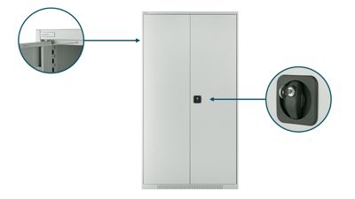 Höchste Präzision bei jeder Bewegung: Die Vollblech-Flügeltüren des Schäfer Shop Genius Mehrzweckschranks der Serie FS öffnen sich dank innenliegender Scharniere sanft bis zu einem Winkel von 110°. Geräuschdämpfende Gummipuffer sorgen für ein angenehmes Schließen, während Sie dank des abschließbaren Drehmuschelgriffs inklusive zweier Schlüssel Ihre Materialien sicher verwahren können.