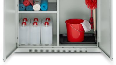 Vereinfachen Sie Ihre Arbeitsabläufe und schaffen Sie hygienische Lagerungsmöglichkeiten mit durchdachten Zubehörteilen für Ihren FS Mehrzweckschrank. Die robuste Abtropfschale schützt den Schrank- oder Fachboden vor Feuchtigkeit und Reinigungsmittelrückständen, während die Ablageschale Flaschen und kleinere Utensilien wie Bürsten oder Schwämme ordentlich verstaut. Der vielseitig einsetzbare Abfallsammler sorgt für eine unkomplizierte Entsorgung direkt am Arbeitsplatz.