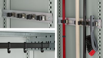 Halten Sie Ihre Arbeitskleidung und Reinigungsutensilien ordentlich verstaut. Die Kleiderstange mit 3 Haken sowie die Gerätehalterleiste sorgen für eine strukturierte Aufbewahrung. Mit Haken und Halterungen zum Einhängen in Orgaset oder Lochrasterwand, wie z. B. Doppelhaken, Werkzeugklemmen oder Schlauchhalter, sind auch Kleinteile und Werkzeuge optimal organisiert. So bleibt alles griffbereit, genau dort, wo Sie es brauchen.