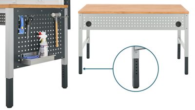 Das niedrige Aufbauportal verwandelt Ihren AST31 Arbeitstisch in ein durchdachtes Arbeitsplatzsystem. Es bietet flexible Befestigungsmöglichkeiten für Sichtlagerkästen, Halterungen für Tablets und Monitore sowie Werkzeughalter. In die stufenlos höhenverstellbare Werkzeuglochplatte können Sie Ihre Ausrüstung einfach und flexibel einhängen. Falls keine passenden Haken oder Halter zur Verfügung stehen, lässt sich mit dem beiliegenden Satz Spreizmuttern improvisieren.