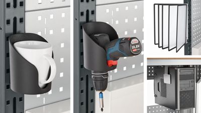Mit speziellen Halterungen organisieren Sie elektronische Geräte und Arbeitsmaterial direkt am Arbeitstisch: Im CPU-Halter findet Ihr PC eine sichere Unterbringung, während magnetische Wandhalter Dokumente ordentlich präsentieren. Offene und geschlossene Universalhalter aus Kunststoff dienen der komfortablen Aufbewahrung von Werkzeugen und Alltagsgegenständen.