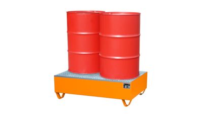 Auffangwanne, für 2 Fässer à 200 l, mit verzinktem Gitterrost, L 1200 x B 800 x H 360 mm, unterfahrbar, Stahl, gelborange RAL 2000