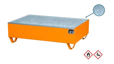 Bei der Wanne handelt es sich um eine Konstruktion aus robustem, 3 mm starkem Stahlblech. Ausgestattet ist sie mit einem verzinkten Gitterrost mit einer Tragfähigkeit von 1000 kg/m2. Sie entspricht der Übereinstimmungserklärung (ÜHP) gemäß StawaR und ist zugelassen für die Lagerung entzündbarer Flüssigkeiten der GHS-Kategorien 1-3 sowie gewässergefährdender Flüssigkeiten der GHS-Kategorien 1-4.